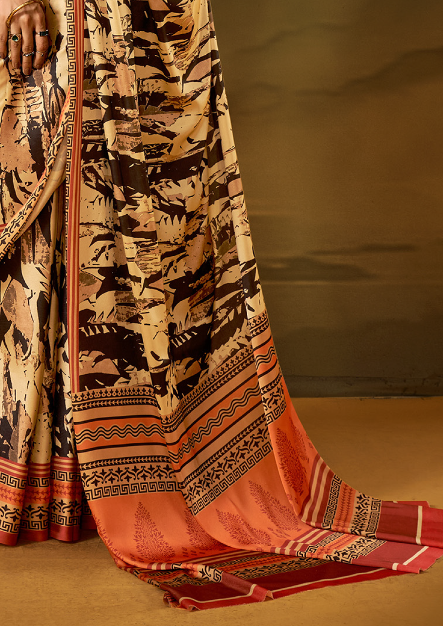 Crepe Beige Printed Designer Saree With Blouse Piece (SATIN81)